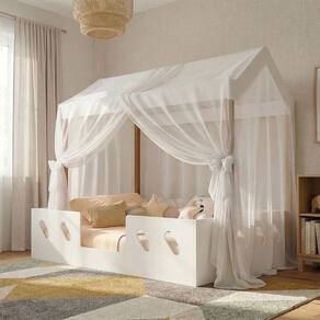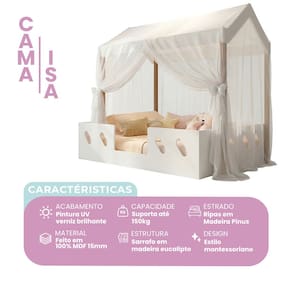 CAMA CASINHA ISA MDF BRANCO 100% 15MM COM VOAL DECORATIVO ESTILO MONTESSORIANO RESISTENTE E MODERNA A Cama Casinha Isa é a escolha perfeita para transformar o quarto infantil em um ambiente lúdico, aconchegante e funcional. Produzida em 100% MDF de 15mm, conta com estrutura reforçada em sarrafo de madeira eucalipto e ripas em madeira pinus, garantindo excelente resistência e durabilidade, com capacidade de suporte de até 150kg. Seu acabamento em pintura UV com verniz brilhante proporciona um visual sofisticado, além de maior proteção e facilidade na limpeza. Acompanha voal decorativo, que traz leveza e charme ao ambiente, deixando o espaço ainda mais acolhedor e encantador. Pensada no conceito montessoriano, a Cama Isa possui estrutura mais baixa, facilitando o acesso e promovendo mais autonomia para os pequenos no dia a dia. Seu estilo moderno e delicado na cor branca combina facilmente com diversos tipos de decoração, criando um espaço harmonioso e acolhedor.