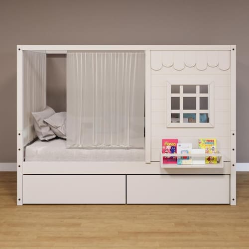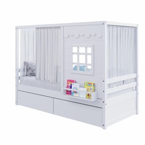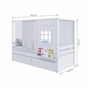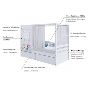 Diferenciais: 02 Gavetas, Cortina, Casinha com fechamento em MDF, Janela e Prateleira para Livros e Decoração,Montagem Reversível (Lado Direito ou Lado Esquerdo)