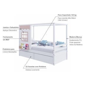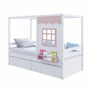 Diferenciais: 02 Gavetas, Casinha com fechamento em MDF, Janela e Prateleira para Livros e Decoração,Montagem Reversível (Lado Direito ou Lado Esquerdo)