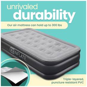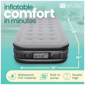 Uma boa noite de sono não deve custar caro o colchão de ar EZ INFLATE oferece uma noite de sono confortável a um preço acessível. Este colchão inflável pode conter até 272 kg e é construído em PVC durável e resistente a perfurações. Não economizamos espaço as camas queen size com colchão de ar EZ INFLATE são projetadas para maximizar o espaço para dormir. As medições são de ponta a ponta na parte superior flocada macia e não nas bordas arredondadas do colchão de ar. Isso significa que você terá mais espaço para dormir. Nosso airbed queen size mede uma superfície completa de 80 x 60. Por dentro, a tecnologia de feixe de bobina fornece o nível perfeito de estabilidade e suporte para uma ótima noite de sono. Suporte adaptável para diferentes estilos de sono o colchão inflável do EZ INFLATE pode personalizar seu colchão inflável de acordo com o nível de ar desejado. Um giro na válvula simples de inflar , desinflar ajudará você a maximizar seu nível de conforto adicionando ou removendo ar. Para uso com ou sem lençóis, a parte superior e as laterais à prova dágua são fáceis de cuidar Apoiado pelo Incrível Atendimento ao Cliente. Esperamos que você nunca precise de nós, mas se precisar, o atendimento ao cliente da EZ INFLATE está aqui para ajudá lo. Sua cama inflável vem com a certeza de saber que você pode pegar o telefone sempre que tiver uma dúvida Marca: Não Informado
