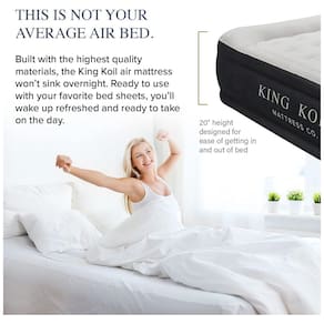 Top de edredão confortável à prova de água extra espesso com apoio extra para a coluna o colchão firme proporciona uma boa postura de dormir o top acolchoado mantém a cama no lugar. Califórnia king size com construção em espiral e uma bomba de 120v , 210w ac embutida dimensões infladas 213 x 18 x se você acidentalmente perfurar ou rasgar seu colchão de ar, todos os colchões de ar King Koil incluem kits de remendo. A bomba interna plug in fácil de usar permite uma inflação , desinsuflação fácil e rápida. O colchão King Koil atinge a inflação total em 2 minutos e 30 segundos. O colchão de ar King Koil foi projetado para uso doméstico e é perfeito para hóspedes que pernoitam, amigos ou parentes e viagens de acampamento. Lembre se de que, embora ela retenha o ar extremamente bem, você sempre pode clicar na bomba por alguns segundos para inflar ou esvaziar até o nível de conforto desejado Marca: Não Informado