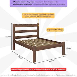 Cama De Casal Madeira Maciça Para Colchão 128/138x188cm Multimóveis Cr35255 Imbuia Imbuia Eleve o conforto e a elegância do seu quarto com a Cama de Casal Madeira Maciça para Colchão 128/138x188cm Multimóveis CR35255. Produzida em madeira de pinus (estrado em eucalipto) proveniente de reflorestamento, esta cama é um exemplo de durabilidade e respeito ao meio ambiente. Seu acabamento em verniz (cor branca possui acabamento em laca) traz um toque sofisticado ao ambiente, enquanto a estrutura robusta suporta até 200kg, garantindo segurança e estabilidade para noites tranquilas. Com dupla furação, a cama é versátil e pode ser utilizada com colchões de 128cm ou 138cm de largura, adaptando-se perfeitamente às suas necessidades. Ideal para casais ou para quem busca um espaço aconchegante e funcional, a cama Multimóveis é a escolha certa para transformar o seu quarto em um verdadeiro refúgio de descanso. NÃO acompanha colchão (tamanho indicado: 128/138x188cm). Conteúdo da Embalagem: 1 (uma) Cama Manual de Montagem Kit Ferragem