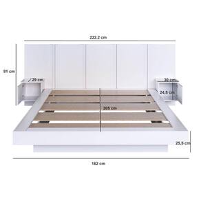 O conjunto CJ075 possui estrutura em MDP 15mm e acabamento FF fosco. Suporta 10kg cada mesa de cabeceira e 200kg na cama. Possui 1 porta de bater com dobradiça metálica cada mesa de cabeceira. Acompanha ferragens para prender na cama ou parede. O material do estrado é MDP, sendo que a altura do estrado até o chão é de 25,5cm. A medida máxima do colchão indicado: CASAL QUEEN: 138cm x 188cm ou 158cm x 198cm. Conteúdo da embalagem: móvel, ferragens e manual de montagem. A fixação das peças e/ou acessórios é feita por parafusos e cavilhas. Para uma limpeza mais efetiva, utilizar apenas pano macio umedecido e sabão neutro. Não utilizar produtos abrasivos. Garantia de 03 meses contra defeitos de fabricação. Medidas do produto (AxLxP):91x222,2x205cm. Peso do produto: 82,9kg. Não acompanha colchão.