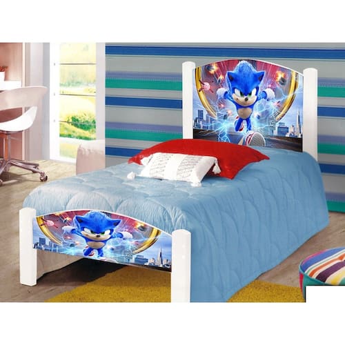 Cama de Criança Solteiro Infantil Adesivada Sonic com Grade de Proteção - Branco