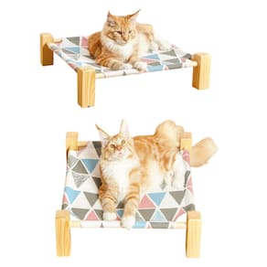 [MATERIAL RESPIRÁVEL E CONFORTÁVEL] --- A cama de rede para gatos é feita de tecido de lona respirável e macio, respirável, forte e durável e não irrita a pele do animal de estimação. para que seu gato fique tranquilo quando estiver na cama. [FÁCIL DE REMOVÍVEL E LAVÁVEL] --- A cama de gato de madeira pode ser facilmente removida e montada do suporte, fácil de lavar e secar. cama de animal de estimação de madeira pode ser usada em ambientes internos e externos