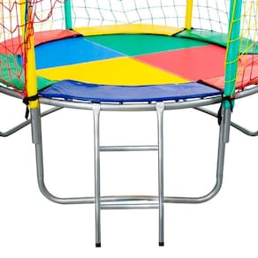 Possui proteção de molas ida com espuma de alta densidade e revestimento em lona vinílica, para não machucar os pés dos usuários, rede de proteção confeccionada em polipropileno colorido malha 12, garantindo muito mais segurança as crianças que utilizarão acama elástica infantil, isotubos blindados para proteção da haste de ferro, escada de ferro com dois degraus para facilitar o acesso aopula pula, ponteiras arredondas de plástico para fixação da rede, além de 42 molas bicônicas de 14cm que garantem o sistema de impulsão dacama elasticacom qualidade! Seu sistema de montagem é totalmente por encaixe, por isso não necessita de ferramentas, tornando a instalação do equipamento rápida e eficiente.
