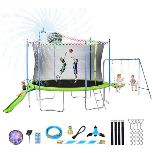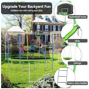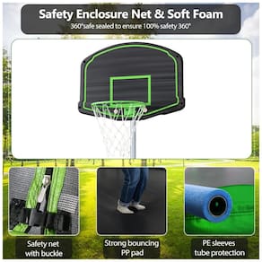 Trampolim 3 em 1Este trampolim infantil foi projetado exclusivamente com 2 balanços, um escorregador e uma cesta de basquete. Mudança de jogo para as crianças terem vários entretenimentos com este trampolim especial. Super Bounce TrampolineSuper salto e capacidade de peso muito mais superior. O tapete de salto de trampolim reforçado usa tecnologia de costura resistente para proporcionar uma vida útil mais longa e melhor ressalto, passou no teste padrão UV americano de 5000 horas. Tudo sobre segurançaTodos os nossos trampolins de 4,2 metros com escorregador são exaustivamente testados quanto à segurança e durabilidade e equipados com tubos de pé grandes em forma de 6 W, mais tubos de pé dispersam mais gravidade dos usuários. Once For All InstallationEste trampolim externo é feito de estrutura galvanizada por dentro e por fora, as pernas são revestidas a pó para proteção extra contra ferrugem. Não há mais necessidade de desmontar o trampolim e trazê lo para casa mesmo em dias de chuva e neve. Estrutura de aço reforçadoA estrutura do nosso trampolim infantil de 4,2 metros com escorrega consiste em aço galvanizado resistente, molas resistentes à ferrugem e pernas espessas em forma de 6 W, aumentando a estabilidade da estrutura e evitando torções estruturais
