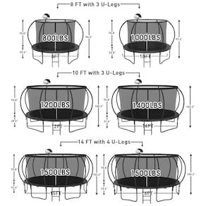 Capacidade de peso de 635 kgEste trampolim resistente de 2023 é feito de aço galvanizado de espessura pulverizada preta. O aço galvanizado tem a característica de durabilidade que faz com que não quebre por mais de 20 anos. Comparado com outros aços usuais, o aço galvanizado é mais estável, brilhante e mais confiável. Proteção segura de 360 A segurança é sempre nosso primeiro objetivo perseguido. E temos tomado mais ações sobre isso agora ou no futuro. Cada trampolim tem mangas de pólo de 8 peças. Os postes do gabinete são acolchoados com espuma de , podem proteger seus filhos de bater contra o poste de aço. Jump Higher Jumper Happier4pcs Pernas em forma de U 8 pontos de contato equilibrados fornecem uma base estável para pular. 80pcs molas tapete de salto de alta densidade fornecem energia para saltar. Será uma plataforma segura para Saltar, Dançar e Ler. Oferecendo a você uma sensação de paz enquanto joga no tatame. Design sem porcaria Este trampolim pode facilmente acomodar uma família de 6 a 7 pessoas, este trampolim de 4,27 metros de largura pode suportar mais de 635 kg. Este trampolim de quintal é um trampolim de mastro curvo com design de rede interna. A rede de proteção envolveu todo o trampolim e a almofada de cobertura de mola é colocada na rede, o que elimina as lacunas entre o tapete e a rede para evitar lesões