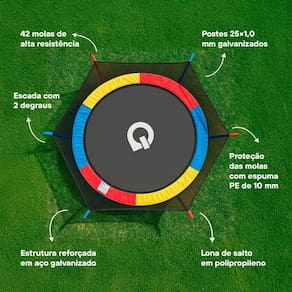 Prática de montar e acompanhar o dia a dia da família, a cama elástica Gallant ainda conta com escada de dois degraus para facilitar o acesso. Uma escolha ideal para transformar quintais, áreas externas e espaços de lazer em ambientes mais ativos, divertidos e seguros.