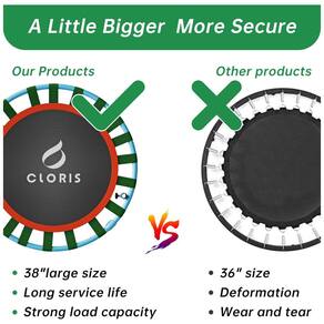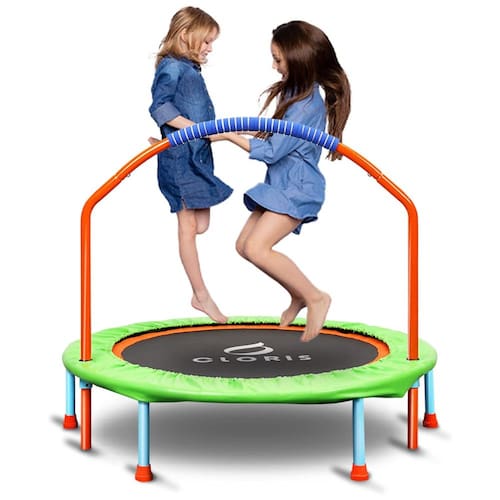PRESENTES IDEAIS PARA CRIANÇAS Sabemos que as crianças são mais atraídas por cores brilhantes do que misturas suaves e cores pastel. Por isso, combinamos diferentes tons de cores para tornar o trampolim mais atraente para as crianças. Além disso, a superfície de recuperação é feita com durabilidade em mente. A superfície é mantida unida por 24 elásticos de tensão resistentes, tornando a completamente livre de ferrugem e capaz de fornecer um salto suficiente e suave. PERNAS DESTACÁVEIS E DESIGN DOBRÁVEL Além de o trampolim ser incrivelmente leve, ele vem com pernas destacáveis e um design dobrável. Ambas as coisas facilitam a movimentação do mini trampolim. Se você deseja movê lo para levá lo a algum lugar ou desmontá lo para guardá lo. Você poderá montar e desmontar o produto sem qualquer aborrecimento, o que pode ajudar aqueles que lidam com espaço limitado. E DIVERTIDO O guidão acolchoado é ajustável de 81 a que se ajusta perfeitamente à altura do seu filho. As crianças podem usar o guidão para fácil aderência para controlar seu salto. Este trampolim sem mola é mais do que os ressaltos de mola, principalmente devido às partes mais macias. Há menos chance de sentir dedos presos ou dedos dos pés, independentemente das precauções de segurança em vigor. Além disso, este trampolim foi adicionado com uma cobertura no topo das bandas para fornecer uma superfície de salto mais segura. FÁCIL DE COLOCAR Este trampolim elástico requer pouca configuração, pois vem com as bandas instaladas e adequadamente enroladas ao redor do quadro quando você as compra. Para facilitar a montagem fácil, também fazemos um vídeo de demonstração para fornecer instruções exatas e passo a passo, garantindo que você aproveite nosso produto mais cedo ou mais tarde