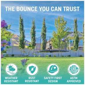 Todos os nossos trampolins são testados quanto à segurança e durabilidade para atender ou exceder todos os padrões da American Society of Testing Materials ASTM, criando um trampolim onde as crianças podem prosperar. PROJETO PATENTEADO Nosso invólucro sem lacunas patenteado elimina lacunas perigosas entre a rede do invólucro e a superfície de salto, protegendo as crianças de pontos de aperto e aberturas Patente RE45, 182. DURABILIDADE Divirta se sem fim em família no seu trampolim com o suporte de uma estrutura de aço galvanizado resistente às intempéries e à ferrugem. Todos os nossos trampolins apresentam soquetes em T reforçados em cada perna e articulação do gabinete, aumentando a estabilidade do quadro. PESO MÁXIMO DO USUÁRIO Testamos minuciosamente nossos produtos de acordo com os padrões ASTM. O peso máximo recomendado do usuário para este trampolim é de 90 kg. De acordo com os padrões ASTM, nossos trampolins são testados para quatro vezes o peso máximo recomendado do usuário