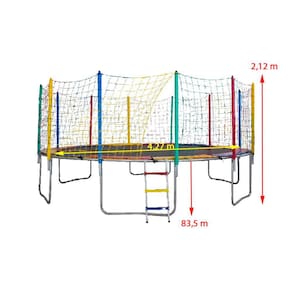 Uma Cama Elástica Completa, com Rede de Proteção Colorida (feita em malha 11) e Protetor de Molas Colorido, feito com espuma de alta densidade para evitar que a criança afunde o pé enquanto está brincando e pulando, além de contar com um revestimento em PVC impermeável.