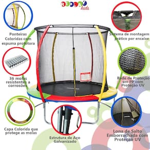 Cama Elástica Trampolim Pula Pula Premium 1,83m com Rede - Replay Kids Com a cama elástica da Replay Kids você e sua família poderão desfrutar horas de diversão Chegou a alegria e diversão para sua casa, priorizando a segurança das crianças. Fácil de montar e desmontar, muito prática de armazenar e transportar. Possui materiais seguros e resistentes para as crianças. Sua impulsão é por mola de aço proporcionando o máximo de segurança para seu filho a tornando sua montagem muito simples. Sua rede possuí zíper para garantir o acesso e segurança das crianças. Possuí ponteiras coloridas com espuma, molas resistentes, capa colorida que protege as molas, lona de salto emborrachada com proteção UV. Sistema de montagem prático e estrutura em aço. Ideal para diversão em família, eventos, festas e férias escolares. Material Resistente, seguro e durável. Principais Características: - Idade recomendada: A Partir de 3 anos - Sistema de montagem por encaixe fácil de montar e desmontar - Molas super macias, tornando assim um salto super macio. - Estrutura de Aço Galvanizado - 3 Pés em Aço Galvanizado - Sistema de Impulsão por 36 molas - 06 Hastes lateral com isolamento colorido - Lona de Salto Colorida com Proteção UV - Proteção de molas coloridas em espuma com revestimento em PVC não absorve água - Rede de Proteção em Polipropileno com Proteção UV - Suporta até 50 kgs Especificações Técnicas: - Conteúdo da Embalagem: 1 Trampolim Grande de 1,83m de Diâmetro - Material/ Composição: Aço Galvanizado e Lona Resistente Polipropileno com Proteção UV - Medida do produto aberto LxHxC 183,0 x 200,0 x 183,0 cm - Altura da base do Trampolim: 46,0 cm - Peso:25,0 kg - : 90 Dias Contra Defeito de Fabricação pelo Fabricante - Código do Fabricante: 21568 - EAN: 7899403215684 - Marca: Replay Kids Imagens meramente ilustrativas, as cores e estampas podem variar de acordo com o lote do fabricante. ATENÇÃO: Antes de começar a utilização desta cama elástica, não se esqueça de ler atentamente todas todo o manual incluso. Homologação Inmetro: 00729/2021-BRINQ-4 Marca: Não Informado