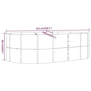 - Cor: cinza- - Forma: oval- - Material: aço revestido a pó de metal- - Acabamento: revestido a pó- - Interno/externo: somente ao ar livre- - Sala: jardim e terraço- - Capacidade: muito espaço para plantas, vegetais, ervas e flores.- - Dimensões: 83,5 x 83,5 x 26,8 polegadas (L x C x A) - - Peso: 29,63 libras- - Drenagem: Não- - Marca: vidaXL- - Entrega contém: manual de montagem incluído.- - Montagem necessária: Sim- - SKU: 319094- - EAN: 8720286857977-
