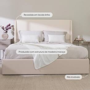 Especificações: Produzido com estrutura e estrado de madeira maciça de reflorestamento de Eucalipto seca e tratada contra insetos e fungos, MDF de alta qualidade revestido em TNT preto. Cabeceira estofada em espuma D-20 revestida em tecido linho. Box da cama estofado em espuma D-16 e revestido em tecido linho. Composição do tecido: Linho 100% Poliéster. Pés de plástico preto resistente e durável. Indicado para ambientes internos. Carga máxima suportada: 250 kg. Altura do chão até o box: 32 cm. Rebaixo para o colchão: 3 cm Altura dos pés: 2 cm.