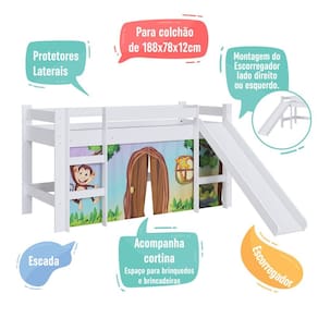 Cama Infantil Alta com Escorregador e Cortina Kids Completa Moveis - Branco