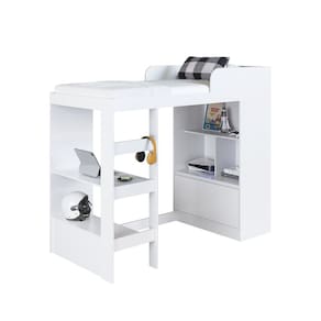 Caracter?sticas: 1 Porta basculante com dobradi?a met?lica 3 Prateleiras que suportam 5kgs cada Acabamento Finish Foil Acetinado Altura do estrado at? o ch?o ? de 136cm Colch?o indicado 78cm x 188cm Estrutura e Escada em eucalipto MDP 15mm N?o acompanha colch?o Possui montagem opcional direita/esquerda Protetor antiqueda com canto arredondado e perfil T Tampo que serve como escrivaninha Suporta at? 100kg