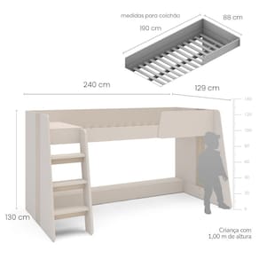 Cama Infantil Alta Solteiro com Escada Isis Mobikasa A Cama Solteiro Infantil Alta com Escada Isis e a escolha ideal para quem busca conforto, seguranca e estilo no quarto das criancas. Com 130 cm de altura, 239,5 cm de largura e 129,2 cm de profundidade, ela apresenta um design moderno e funcional, combinando o tom elegante com o aconchego. Conta com protecao lateral e cantos arredondados para garantir a seguranca, alem de uma escada pratica que facilita o acesso por ser uma cama alta. Produzida com pintura UV de alta durabilidade, e resistente, facil de limpar e mantem o brilho por muito mais tempo.