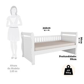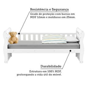 Caracteristicas: Acabamento em pintura UV Atoxica Bordas arredondadas e laqueadas Cama suporta ate 90kg Estrutura 100 em MDF 12mm Grade e cabeceiras MDF 25 e 12 mm e as barras centrais em MDF 25mm Nao acompanha colchao Material do estrado madeira Tamanho do colchao indicado -LxC - cm-: 88 x 188 -Solteiro- Tipo de estrado fixo -altura 36,4cm- Tipo de grades fixas