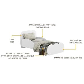 A Mini Cama Nuvem da Multimóveis transforma o quarto em um cenário perfeito, a cabeceira e peseira são em formatos de nuvem, as laterais funciona com grade de proteção, para um sono tranquilo de toda família. A estrutura baixa, permite a liberdade de movimentação da criança de forma segura.