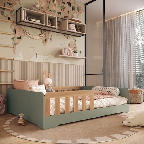 Cama Infantil Montessoriana Casal Em MDF Tony Mobikasa A Cama Montessoriana Tony Mobikasa é a escolha perfeita para quem busca aliar funcionalidade, segurança e design no quarto infantil. Produzida em 100 MDF , ela oferece uma estrutura robusta e acabamento refinado, garantindo durabilidade e resistência para acompanhar as diferentes fases da infância. Com um estilo moderno e linhas suaves, a cama conta com laterais de proteção em tom amadeirado, proporcionando mais segurança durante o sono. A altura reduzida em relação ao chão é ideal para estimular a autonomia das crianças, permitindo que elas entrem e saiam da cama com facilidade e segurança. A Cama Tony é perfeita para criar um quarto montessoriano, onde a criança se sente livre para explorar e desenvolver sua independência de maneira segura e confortável.
