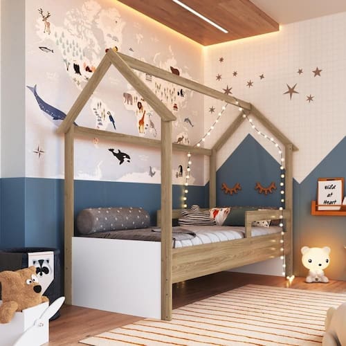 A Cama Infantil Montessoriana Casinha para Menino e Menina de Solteiro com Proteção Lateral da Completa Móveis traz um conceito Montossori lúdico com o conceito para estimular a autonomia e aperfeiçoar o potencial criativo das crianças desde a primeira infância. Com grades laterais de proteção e com cantos arredondados, propicia mais para o seu pequeno. Possui ainda duas possibilidades de montagem na altura do estrado (colchão).