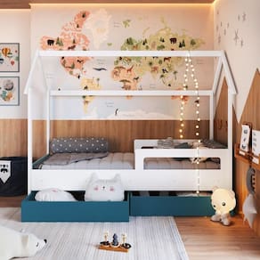 A Cama Infantil Montessoriana Casinha Solteiro Menino Menina com Proteção Lateral e Gavetas com Rodas da Completa Móveis traz um conceito Montossori lúdico com o conceito para estimular a autonomia e aperfeiçoar o potencial criativo das crianças desde a primeira infância. Com grades laterais de proteção e com cantos arredondados, propicia mais para o seu pequeno.
