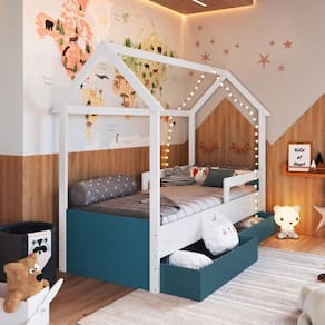 A Cama Infantil Montessoriana Casinha Solteiro Menino Menina com Proteção Lateral e Gavetas com Rodas da Completa Móveis traz um conceito Montossori lúdico com o conceito para estimular a autonomia e aperfeiçoar o potencial criativo das crianças desde a primeira infância. Com grades laterais de proteção e com cantos arredondados, propicia mais para o seu pequeno.