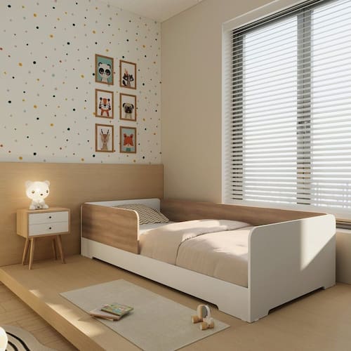 A Cama Montessoriana Mark é perfeita para a fase de transição do berço para a cama, unindo segurança, conforto e autonomia para os pequenos. Com design moderno e acabamento em branco com louro freijó, ela se destaca no quarto infantil com muito charme.