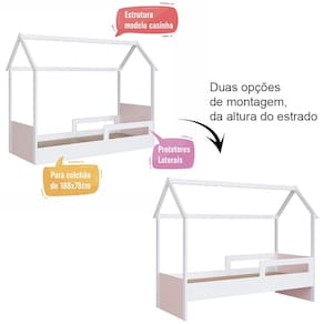 Características Estrutura Modelo Casinha em MDP Acabamento Fosco Protetores Laterais Estrado Lastros em MDF cru Sapatas Plásticas Possui ainda duas possibilidades de montagem na altura do estrado, sendo rente ao chão ou 21,2 cm Suporta até 80 kg sem Impacto IDEAL PARA COLCHÃO 188 X 78cm NÃO ACOMPANHA COLCHÃO
