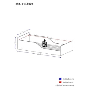Dimensões do produto montado: Altura: 37cm | Largura: 153,5cm | Profundidade: 74cm (Não acompanha colchão. Tamanho Indicado: 1,50 x 0,70 m) *Você pode consultar as medidas internas na imagem técnica do produto.