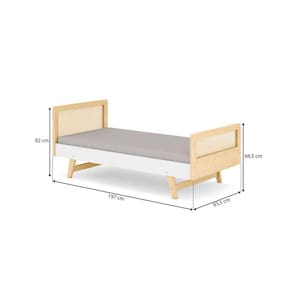 Cama Infantil Solteiro Montessoriana Lift em Madeira Maciça com Rattan Casatema Branco/Natural. A Cama solteiro Lift é um produto inovador e super versátil. Possui um mecanismo em seus pés que permite utilizar a cama em duas alturas. Pode ser no modelo de cama tradicional ou cama montessoriana, bastando levantar ou baixar os pés.É perfeita para os filhos em fase de crescimento, oferecendo segurança e longevidade em seu uso.Acabamento com pintura PU em cabines individualizadas, com resistência e uma qualidade muito superior ao produto. Utilizamos também o Rattan na Cabeceira e Peseira, trazendo um ar de modernidade e diferenciação para o ambiente do quarto.Ela é produzida em madeira maciça reflorestada, ou seja, é um material renovável,o que garante que a madeira foi obtida de fontes ecológicas e sem prejudicar o meio ambiente.As barras são em MDF, garantindo qualidade e durabilidade