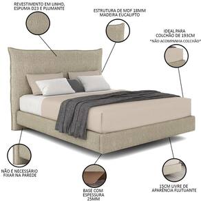 Características do Produto Material da estrutura: MDF 18mm/Madeira de Eucalipto. Material e Densidade da Espuma: Plumante/Espuma D23. Peso Suportado: 500 Kg. Revestimento: Linho. Possui Base: Sim. Material da Base: MDF 25mm. Acompanha Colchão: Não. Acompanha Cabeceira: Sim. Diferenciais: - Design moderno. - Cabeceira estofada. - Aparência flutuante. Sistema de Montagem: Parafusos. Manual de Montagem: Sim. Complexidade da Montagem: Média. Conteúdo da Embalagem: 1 Cama. Volumes: 3 Volumes. Garantia do Fabricante: 90 dias contra defeitos de fabricação. Montagem: Recomendamos que seja feita por um profissional. Recomendação de limpeza: Utilize pano levemente úmido.