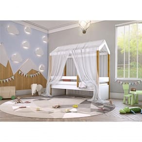 Cama Montessori Cabana Solteiro Com Colchão E Dossel Branco Cama Montessori Exclusiv Solteiro com Colchão e Voal Branco