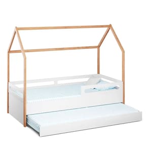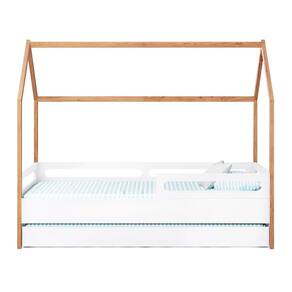 Além disso, a cama conta com a opção de incluir uma cama auxiliar, perfeita para acomodar irmãos ou visitas de maneira prática e confortável. O estrado pode ser montado diretamente no chão, seguindo os princípios montessorianos, ou em uma altura maior para a instalação da cama auxiliar.