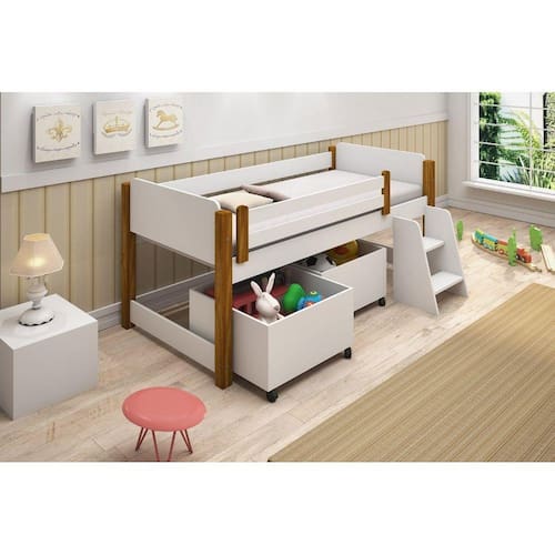 Cama Naty Branco/Mel com 2 nichos e escadinha Dimensões do Produto Montado: Altura: 78 cm Largura: 95 cm Profundidade: 200 cm Observações: - Material: MDF 15mm / Estrado Madeira Pinus - Pés 5x5 cm em Madeira - Pintura Verniz - Tamanho da Cama: Solteiro - Ideal para Colchões: 88 x 188cm (colchão não incluso) - Peso Suportado: 100 kg Mais informações - Dimensões da Escada: Alt.: 46 cm x Larg.: 33 cm x Comp.: 27 cm; - Alt. do chão barra: 38 cm - 88 x 188cm (colchão não incluso) Informações adicionais: - Verifique o tamanho e os detalhes do produto antes de realizar a compra. - As fotos são meramente ilustrativa. - A transportadora entregará o produto no portão e/ou portaria da residência, ou ainda, somente no andar térreo, em caso de prédios, do endereço de entrega. - Avaliar a mercadoria no ato do recebimento e recusar em caso de divergência ou avarias. - Não nos responsabilizamos pela montagem e desmontagem do produto no ato da entrega e devolução, assim como os custos gerados nestas situações. - Sugerimos a contratação de um montador profissional para a montagem do produto. Não nos responsabilizamos por avarias causadas no ato da montagem.