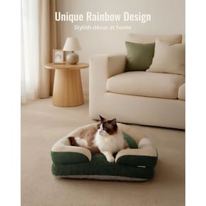 Todo animal de estimação merece uma cama onde se sinta amado, porque para nós, eles são familiares. Mime seu amado amigo peludo com a cama para animais de estimação com tema de arco-íris Blissful Diary para gatos e cães. Com um tom verde suave, esta cama aconchegante para gatos adiciona uma vibração alegre e relaxante à decoração da sua casa. Seja colocado na sala de estar ou no quarto, não é apenas um local de descanso macio para o seu companheiro peludo, mas uma peça de declaração que melhora o seu espaço. Aproveite aqueles momentos felizes de união quando seu gatinho ou filhote se aconchega perto de você ou compartilha momentos de silêncio ao seu lado. Feito com espuma picada, lã de pelúcia macia, um encosto alto e um apoio de braço elevado semelhante a um travesseiro, este sofá-cama para gatos de tamanho pequeno oferece suporte excepcional para o seu animal de estimação, promovendo uma melhor postura e um sono mais reparador. Toda a cama é lavável na máquina para facilitar a limpeza, enquanto o fundo antiderrapante adiciona segurança extra. Esta cama lavável para gatos e filhotes faz com que seu animal de estimação se sinta seguro, confortável e feliz. Você pode finalmente encontrar uma cama tão fofa e aconchegante quanto seu amigo peludo, oferecendo conforto, segurança e beleza. Seu pequeno gato ou cachorro vai adorar!