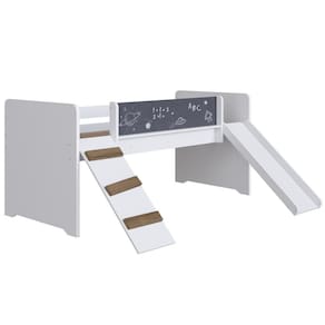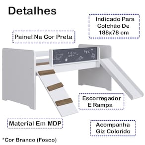 MDPA Cama Playground Com Escorregador E Rampa é perfeita para que seus filhos tenham grandes aventuras em pouco espaço. Estrutura em MDP de 15 mm, e excelente acabamento em Finish Foil (Fosco). Ela é composta por um escorregador, uma rampa, um painel na cor preta aonde a criançada pode desenhar e escrever o que quiser e melhor ainda, acompanha giz colorido. Acompanha sapatas plásticas. O colchão indicado é de 188x78 (Não Acompanha Colchão). A cama playground suporta até 50 kg distribuídos. Com resistência mecânica, permitindo que a brincadeira seja segura, sem riscos de quedas ou afrouxamento dos componentes. Este móvel chegará em sua casa separado em 03 volumes.