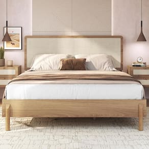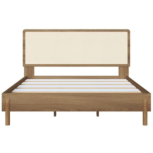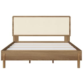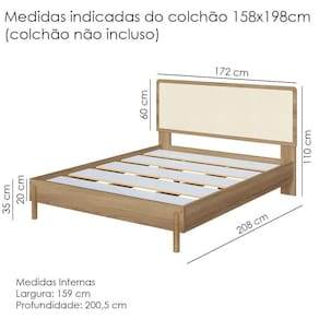 Cama Queen 27056 combina design escandinavo com praticidade para o dia a dia. Estrutura em MDP (15/25 mm) e acabamento em pintura BP. No estilo minimalista, é composta por aplique de tela sintética (PVC com poliéster), pés em madeira maciça eucalipto (centrais em MDP 25 mm) e furação extra na cabeceira para ajuste de altura na montagem. Medidas indicadas do colchão: 158x198 cm (não acompanha colchão). Produto entregue em 3 volumes.