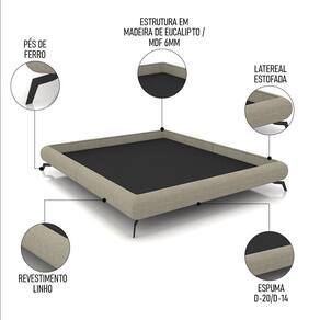 A Base Para Colchão é produzida com madeira de eucalipto e chapas de MDF 6MM, que conferem resistência e estabilidade à estrutura. As laterais são com espuma D20/D14, que proporcionam maciez e proteção. Além disso, a base para colchão casal é revestida em linho, um tecido nobre e elegante, que dá um toque de sofisticação ao seu quarto. A base é ideal para Colchão Queen 158x198cm e é bipartida, ou seja, dividida em duas partes, o que facilita o transporte e a montagem. Os pés de ferro dão um toque de elegância ao Quarto De Casal, e garantindo segurança e firmeza à base. Ela é perfeita para quem busca um produto de alta qualidade, beleza e conforto.