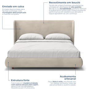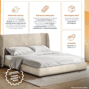 OBSERVAÇÃO: NÃO ACOMPANHA COLCHÃO Carregador USB adicional por R$ 150,00 a unidade. Pode ser acertado no chat logo após a compra da cama. Com estilo moderno, linhas atuais e suaves, as camas Damie são feitas a mão com tecidos de alto padrão, tornando-se um elemento de muita personalidade em qualquer estilo de decoração. A Cama Damie apresenta um estilo moderno com linhas atuais e suaves de sua cabeceira tornam esta cama um elemento de muita personalidade em qualquer estilo de decoração. Toda estofada e ergonômica, leva muito conforto para sua horas de sono. Disponível em tecidos boucle exclusivos e previamente selecionados de alto padrão e em medidas para os tamanhos (Casal, Queen ou King), a Cama Damie é estruturada em madeira de reflorestamento de Eucalipto Saligna. (possui resina natural anti-cupim) tratadas e beneficiadas para evitar empenamentos. OBSERVAÇÃO: Não acompanha colchão. Produto entregue desmontado – Acompanha manual de montagem. Garantia Geral de 01 Ano. Design assinado por Damie Studio. Produto exclusivo direto de Fábrica.