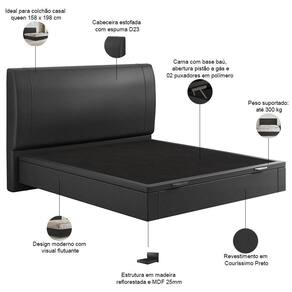 ColorFamily: Preto | Model: Spazio | MaterialFamily: Madeira, MDF, Couro sintético e espuma | OriginCountry: Brasil | ProductWarranty: 90 dias após o recebimento do produto | ProductHeight: 144 cm | OriginState: PR | ProductWidth: 174 cm | ProductLength: 213 cm | ProductWeight: 69 kg | SizeDescription: Altura: 144 cm x Largura: 154 cm x Profundidade: 203 cm | Color: Preto | Material: Estrutura em Madeira, MDF, Revestimento em Couro sintético e espuma | ColorSimple: Preto | ColorSupplier: Preto | SupplierSimpleName: Cama Queen Baú Flutuante Com Cabeceira 160cm Spazio S04 Couríssimo Preto - Lyam Decor | ProductContents: 1 Cama, 1 Cabeceira | ProductInstructions: Produto para uso em ambiente interno, nao devendo ficar exposto ao sol, calor e umidade excessivos.