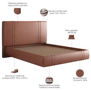 Se o seu quarto de casal pede um toque de modernidade com pureza de linhas e conforto impecável, a Cama Queen Flutuante Astra 160cm é a escolha perfeita. Com seu design suspenso, essa cama flutuante cria a ilusão de leveza e espaço, transformando o ambiente em um refúgio contemporâneo. Já a cabeceira estofada, com espuma de alta densidade, oferece suporte perfeito para momentos de leitura ou relaxamento, enquanto os materiais nobres - como madeira de reflorestamento e tecido premium - garantem durabilidade e um visual impecável. Além disso, a base reforçada em MDF 25mm mantém o foco na simplicidade elegante e na qualidade estrutural, proporcionando noites de sono revigorantes. Ideal para quem valoriza um quarto de casal minimalista, porém acolhedor, essa cama de casal é a fusão perfeita entre design arrojado e conforto sem complicações. Renove seu espaço com a Cama Queen Flutuante Astra e durma em um ambiente que respira estilo e tranquilidade. Conforto elevado, beleza sem limites. Dimensões total do produto (L x A x P) 180 x 130 x 217 cm Medidas Internas Espaço interno da cama (L x A x P): 158 x 7 x 198 cm Cabeceira (L x A x P): 180 x 130 x 8 cm Altura livre da cabeceira: 78 cm Altura do chão à base da cama: 15 cm Externa da cama (L x A): 170 x 20 cm Características: Estrutura em madeira de eucalipto e MDF 18mm e 25mm. Revestimento em tecido Couríssimo de alta qualidade na tonalidade Telha. Cabeceira estofada com espuma D23 e plumante. Base da cama com design moderno e visual flutuante. Ideal para colchão casal queen 158 x 198 cm. Peso suportado: até 500 kg. - Por se tratar de estofado as medidas podem ter uma pequena variação de até 3 cm.