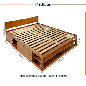 A Cama Irara além de possuir um design moderno, conta com vários compartimentos, como gavetas, prateleiras e Mesas de Cabeceira, os quais proporcionam um espaço a mais para que você possa guardar roupas de cama, objetos de decoração, ou o que desejar. Perfeita para dar aquele toque especial na organização do ambiente, otimizando espaço. Produzida em madeira maciça de pinus e acabamento em pintura UV Caramelo. Pintura que deixa em evidência os veios e nós da madeira de pinus, detalhe que proporciona delicadeza e elegância ao móvel. Acabamento da Gaveta: Pintura Acabamento da Prateleira: Pintura Acompanha Cama Auxiliar: Não Acompanha Colchão: Não Altura do Estrado até o Chão: 40 cm Ambiente Principal: Quarto Complexidade da Montagem: Alta: deve ser montado por um montador especializado Cor: Caramelo Cor do Produto: Caramelo Escala de Brilho: Fosco Escala de Brilho da Gaveta: Fosco Escala de Brilho da Prateleira: Fosco Extensível: Não Gaveta com Chave: Não Informações Complementares: Gaveta superior da mesa de cabeceira suporta até 2kg. Gaveta inferior da mesa de cabeceira suporta até 3kg Itens Inclusos: 1 Cama Queen , 2 Mesas de Cabeceira, 1 Kit de Ferragens e 1 Manual de Montagem Linha ou Coleção: Irara Manual de Montagem e Instalação: https://product-hub-prd.madeiramadeira.com.br/871650/documents/325d6e71-8cfd-4c1d-80fb-1d704154f8d6aldemontagemcamairaraqueen.pdf Material da Gaveta: Madeira Maciça Material da Prateleira: Madeira Maciça Material do Estrado: Madeira Maciça Material Principal: Madeira Maciça Necessita Montagem: Sim Origem do Produto: Nacional Permite a Utilização de Cama Auxiliar: Não Peso: 84,6 kg Peso Máximo por Gaveta: 5 kg Peso Máximo por Prateleira: 5 kg Possui Baú: Não Possui Gavetas: Sim Possui Pés: Não Possui Portas: Não Possui Prateleiras: Sim Possui Rodízio: Não Quantidade de Gavetas: 03 Gavetas Quantidade de Prateleiras: 01 Prateleira Recomendações de Uso, Manutenção e Limpeza: Pano seco Sistema de Montagem: Parafusos e Cavilhas Tamanho do Colchão Indicado (L x C): 158cm x 198cm Tipo de Cama: Convencional Tipo de Colchão: Queen Tipo de Corrediça da Gaveta: Metálica Simples Tipo de Estrado: Fixo Tipo de Madeira Maciça: Pinus Tipo de Madeira Maciça da Gaveta: Pinus Tipo de Madeira Maciça da Prateleira: Pinus Tipo de Puxador da Gaveta: Embutido Ean: 7909903442739