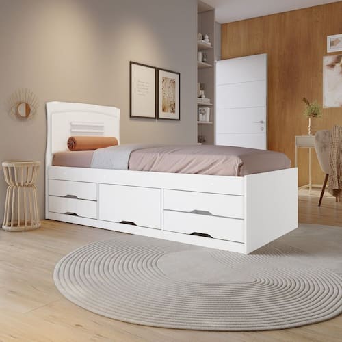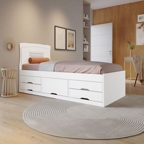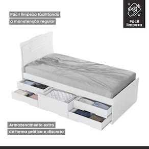 Maximize o espaço do seu quarto com a Cama Solteiro Alice! Com 5 gavetas práticas e espaçosas, ela é perfeita para quem busca otimizar a organização sem abdicar do estilo. A Cama Alice oferece armazenamento extra para roupas, acessórios e objetos pessoais, mantendo tudo sempre à mão e o ambiente mais organizado. Ideal para quartos pequenos ou para quem deseja um espaço funcional e moderno, a Cama Solteiro Alice transforma o ambiente com elegância e praticidade. Invista em conforto e aproveite cada detalhe dessa cama projetada para o seu bem-estar. Não perca a chance de ter a sua! Produto Montado: Sim Acabamento da Gaveta: Pintura Acompanha Cama Auxiliar: Não Acompanha Colchão: Não Altura do Estrado até o Chão: 44,5 cm Ambiente Principal: Quarto codigo_ean: 7900288001313 Complexidade da Montagem: Média: pode ser montado por mais de uma pessoa e/ou necessite de maior conhecimento para montagem Cor: Branco Cor do Produto: Branco Cor Flex: Não Escala de Brilho: Semi-Brilho Escala de Brilho da Gaveta: Brilhante Extensível: Não Gaveta com Chave: Não Itens Inclusos: 1 Cama + 1 Manual de Montagem + 1 Kit Ferragens Linha ou Coleção: Júlia Manual de Montagem e Instalação: https://product-hub-prd.madeiramadeira.com.br/966359/documents/0bca88ab-86e4-40dd-a916-8c14ac7bb737ualcamajliabiancamarcela5g.pdf Marca: Conquista Móveis Material da Gaveta: MDF/MDP Material do Estrado: Pinus e Eucalipto Material Principal: MDF/MDP Montagem Flex: As gavetas podem ser montadas tanto do lado direito ou esquerdo. Necessita Montagem: Sim Origem do Produto: Nacional Permite a Utilização de Cama Auxiliar: Não Peso: 51 kg Peso Máximo por Gaveta: 5 kg Possui Baú: Não Possui Gavetas: Sim Possui Pés: Não Possui Portas: Não Possui Prateleiras: Não Possui Rodízio: Não Quantidade de Gavetas: 05 Gavetas Recomendações de Uso, Manutenção e Limpeza: Na limpeza não utilizar produtos químicos e abrasivos, usar apenas um pano umedecido para garantir a maior durabilidade do móvel. Sistema de Montagem: Parafusos, Cavilhas e Pregos Tamanho do Colchão Indicado (L x C): 88cm x 188cm Tipo de Cama: Convencional Tipo de Colchão: Solteiro Tipo de Corrediça da Gaveta: Metálica Simples Tipo de Estrado: Fixo Tipo de Puxador da Gaveta: Embutido