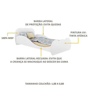 Além disso, a cama é produzida em 100% MDF, material resistente e durável, proporcionando maior estabilidade. Seu acabamento em pintura UV garante uma superfície lisa ao toque e fácil de limpar. A barra lateral de proteção oferece segurança extra durante o sono, enquanto sua estrutura suporta até 90kg sem comprometer seu design moderno.