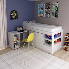 A Cama Solteiro com Escrivaninha para Colchão 88 x 188 cm Multimóveis CR35067 é produzida em MDP com acabamento em BP (Suporta até 130kg), o que garante maior durabilidade e resistência. Produto com diversas funcionalidades para agregar conforto e praticidade no ambiente. Conta com gaveta, prateleiras e nichos com um amplo espaço para armazenar itens pessoais ou de decoração. Possui escrivaninha retrátil para otimização de espaço possibilitando que seu filho tenha um cantinho de estudos no conforto do seu quarto.