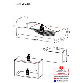 Dimensões do produto montado: Cama - Altura: 71cm | Largura: 193cm | Profundidade: 104cm Mesa de Cabeceira - Altura: 39,5cm | Largura: 62,5cm | Profundidade: 31,5cm *Você pode consultar as medidas detalhadas na imagem técnica do produto.