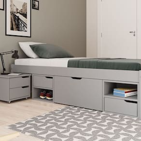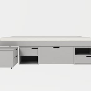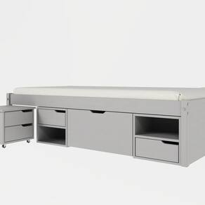 A Cama de Solteiro Charme é uma ótima opção para decorar seu ambiente. Além de possuir um design moderno, conta com vários compartimentos, como gavetas, nichos e mesa de cabeceira, os quais proporcionam um espaço a mais para que você possa guardar roupas de cama, objetos de decoração, ou o que desejar. As gavetas menores são soltas para você colocá-las nos nichos que preferir. Perfeita para dar aquele toque especial na organização do ambiente, otimizando espaço. Produzida em madeira maciça de pinus e acabamento cinza. Pintura que deixa em evidência os veios e nós da madeira de pinus, detalhe que proporciona delicadeza e elegância ao móvel . Acabamento da Gaveta: Pintura Acompanha Cama Auxiliar: Não Acompanha Colchão: Não Altura do Estrado até o Chão: 41 cm Ambiente Principal: Quarto Complexidade da Montagem: Baixa: pode ser montado por uma pessoa sozinha Comprimento: 96 cm Cor: Cool Grey Cor do Produto: Cool Grey Escala de Brilho: Semi-Brilho Escala de Brilho da Gaveta: Semi-Brilho Extensível: Não Gaveta com Chave: Não Informações Complementares: Camas Itens Inclusos: 1 Cama, Kit de ferragens e Manual de Montagem Linha ou Coleção: Charme Manual de Montagem e Instalação: https://product-hub-prd.madeiramadeira.com.br/915653/documents/388cf323-cfad-4755-bc56-f278d00254d7c6CamaCharme90X190Montagem.pdf Material da Gaveta: Madeira Maciça Material do Estrado: Pinus Material Principal: Madeira Maciça Necessita Montagem: Sim Origem do Produto: Nacional Permite a Utilização de Cama Auxiliar: Não Peso: 43,5 kg Peso Máximo por Gaveta: 5 kg Possui Baú: Não Possui Gavetas: Sim Possui Pés: Não Possui Portas: Não Possui Prateleiras: Não Possui Rodízio: Não Recomendações de Uso, Manutenção e Limpeza: Não colocar o produto em lugar úmido, não arrastar, limpar somente com pano macio e seco, não expor o produto a incidência de luz solar, não colocar peso superior ao indicado. Sistema de Montagem: Parafusos, pregos, cavilhas, entre outros. Tamanho da Cama: Solteiro Tamanho do Colchão Indicado (L x C): 88cm x 188cm Tipo de Cama: Convencional Tipo de Colchão: Solteiro Tipo de Corrediça da Gaveta: Madeira Tipo de Estrado: Fixo Tipo de Madeira Maciça: Pinus Tipo de Madeira Maciça da Gaveta: Pinus Tipo de Puxador da Gaveta: Embutido