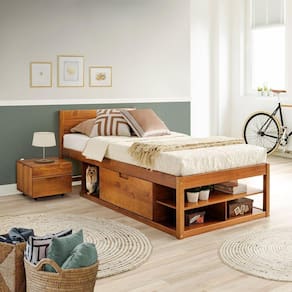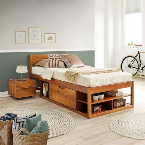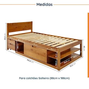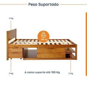 A Cama Irara além de possuir um design moderno, conta com vários compartimentos, como gavetas, prateleiras e Mesas de Cabeceira, os quais proporcionam um espaço a mais para que você possa guardar roupas de cama, objetos de decoração, ou o que desejar. Perfeita para dar aquele toque especial na organização do ambiente, otimizando espaço. Produzida em madeira maciça de pinus e acabamento em pintura UV Branco Lavado. Pintura que deixa em evidência os veios e nós da madeira de pinus, detalhe que proporciona delicadeza e elegância ao móvel. Acabamento da Gaveta: Pintura Acabamento da Prateleira: Pintura Acompanha Cama Auxiliar: Não Acompanha Colchão: Não Altura do Estrado até o Chão: 40 cm Ambiente Principal: Quarto Complexidade da Montagem: Alta: deve ser montado por um montador especializado Cor: Caramelo Cor do Produto: Caramelo Escala de Brilho: Fosco Escala de Brilho da Gaveta: Fosco Escala de Brilho da Prateleira: Fosco Extensível: Não Gaveta com Chave: Não Informações Complementares: Gaveta superior da mesa de cabeceira suporta até 2kg. Gaveta inferior da mesa de cabeceira suporta até 3kg Itens Inclusos: 1 Cama de Solteiro , 1 Mesa de Cabeceira, 1 Kit de Ferragens e 1 Manual de Montagem Linha ou Coleção: Irara Manual de Montagem e Instalação: https://product-hub-prd.madeiramadeira.com.br/871598/documents/dee04200-8668-407c-a8b2-a811c9c55839aldemontagemcamairaraqueen.pdf Material da Gaveta: Madeira Maciça Material da Prateleira: Madeira Maciça Material do Estrado: Madeira Maciça Material Principal: Madeira Maciça Necessita Montagem: Sim Origem do Produto: Nacional Permite a Utilização de Cama Auxiliar: Não Peso: 49,4 kg Peso Máximo por Gaveta: 5 kg Peso Máximo por Prateleira: 5 kg Possui Baú: Não Possui Gavetas: Sim Possui Grade: Não Possui Pés: Não Possui Portas: Não Possui Prateleiras: Sim Possui Rodízio: Não Quantidade de Gavetas: 03 Gavetas Quantidade de Prateleiras: 01 Prateleira Recomendações de Uso, Manutenção e Limpeza: Pano seco Sistema de Montagem: Parafusos e Cavilhas Tamanho do Colchão Indicado (L x C): 88cm x 188cm Tipo de Cama: Convencional Tipo de Colchão: Solteiro Tipo de Corrediça da Gaveta: Metálica Simples Tipo de Estrado: Fixo Tipo de Madeira Maciça: Pinus Tipo de Madeira Maciça da Gaveta: Pinus Tipo de Madeira Maciça da Prateleira: Pinus Tipo de Puxador da Gaveta: Embutido Ean: 7909903442715